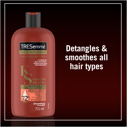 TRESemme Keratin Smooth Frizz Control Lower Sulphate Shampoo, with Keratin and Marula oil, gives you 5 smoothing benefits for hair thats silky smooth but still full of natural movement. This salon-quality smoothing shampoo detangles and smooths your hair for shiny, smooth-flowing locks. The lower sulphate formula detangles knots, boosts shine, adds softness, tames flyaways, and keeps hair smooth for up to 72 hours. This is one simple system with five benefits that is gentle enough for daily use. Instructions: Start with Keratin Smooth Shampoo for gentle cleansing. Apply a generous amount to wet hair, gently massage the scalp and roots with finger tips to work into a lather. Rinse thoroughly. Follow with Keratin Smooth Conditioner for luxuriously smooth hair that lasts.